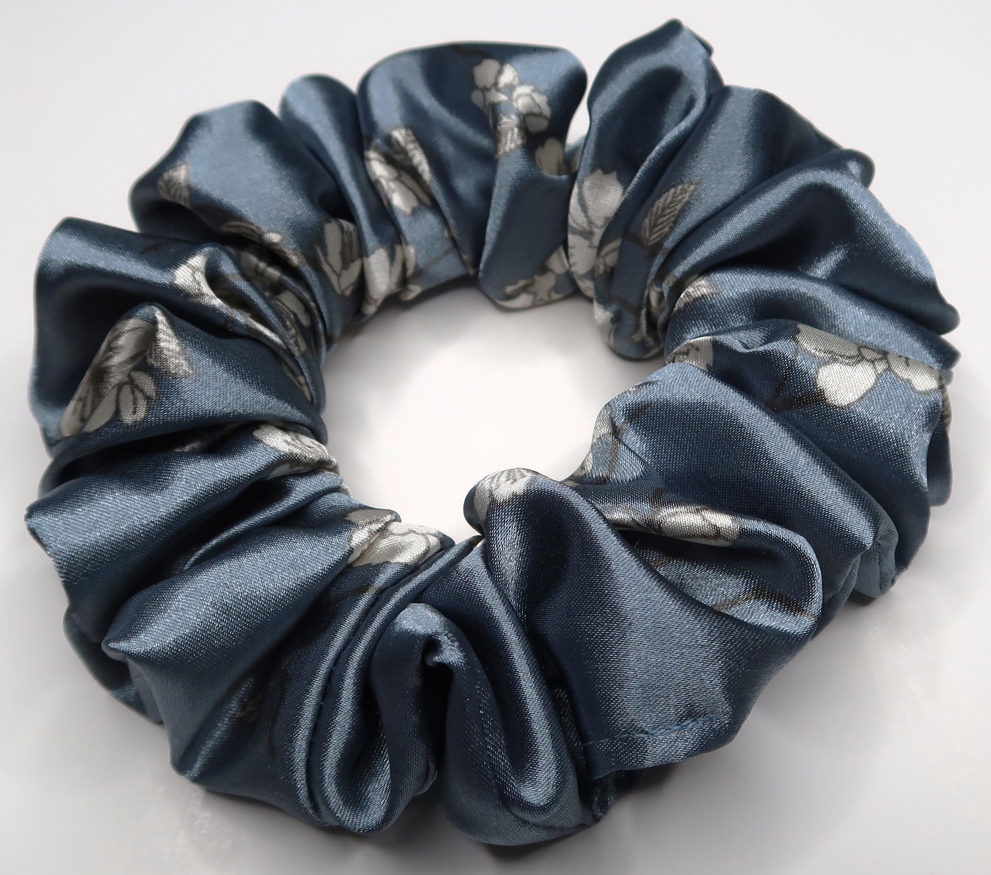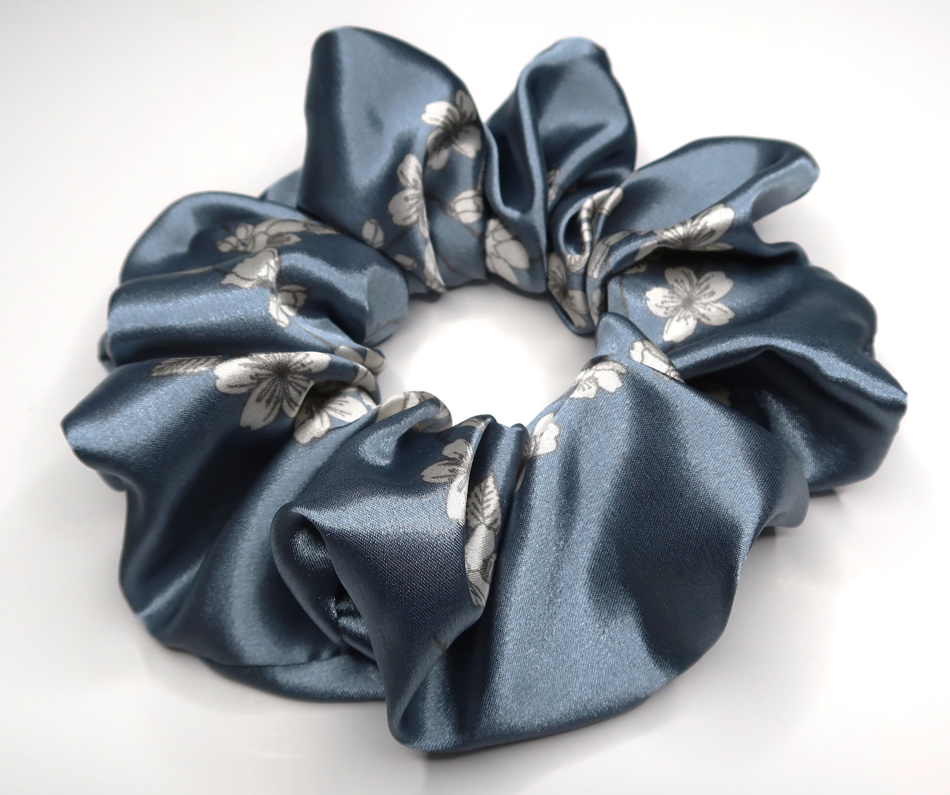 These light blue with printed scrunchies are handmade in the United Kingdom.